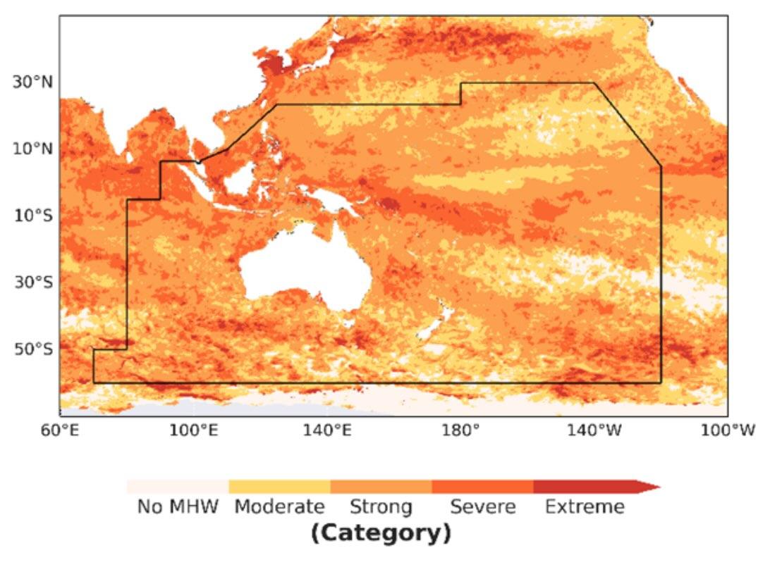 Det omkring 40 miljoner kvadratkilometer stora området som utsattes är nästan lika stort som Asien, och är den största sedan mätningarna startade 1993. Förutom fiskdöd kopplas värmeböljorna till korallblekning.